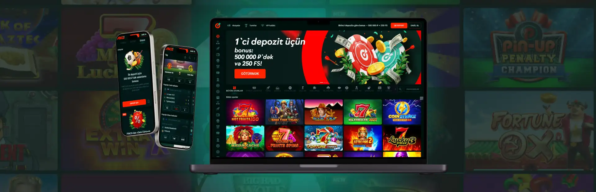 | Oynatma üçün oyunlar | Pinco slot (100%), ruletka/bləkcek (5–10%) |